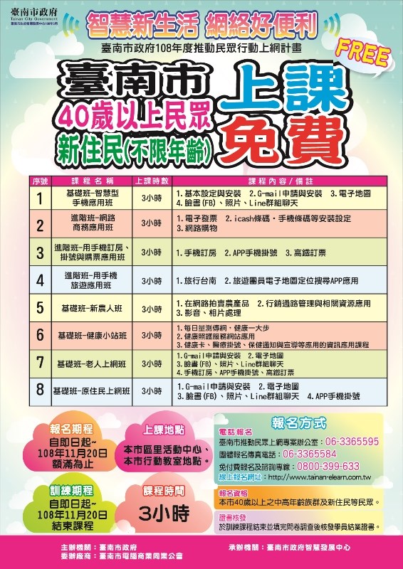 主旨:有關本府辦理「108 年度臺南市政府推動民眾行動上網計畫」研習,請協助宣傳及海報張貼,請查照。